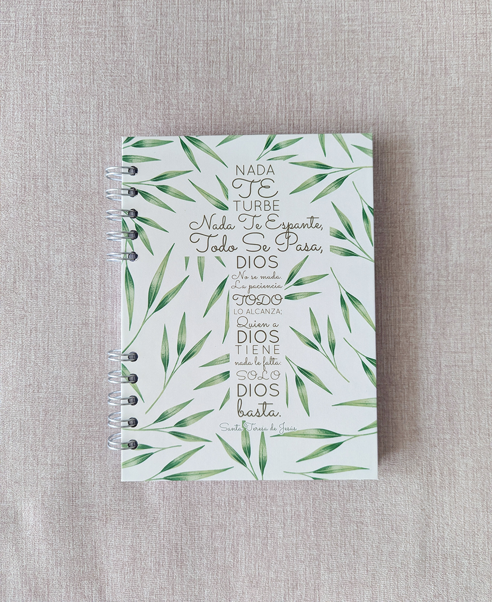 Portada y contraportada de pasta dura. Arte con la oración de Santa Teresita de Jesús.
