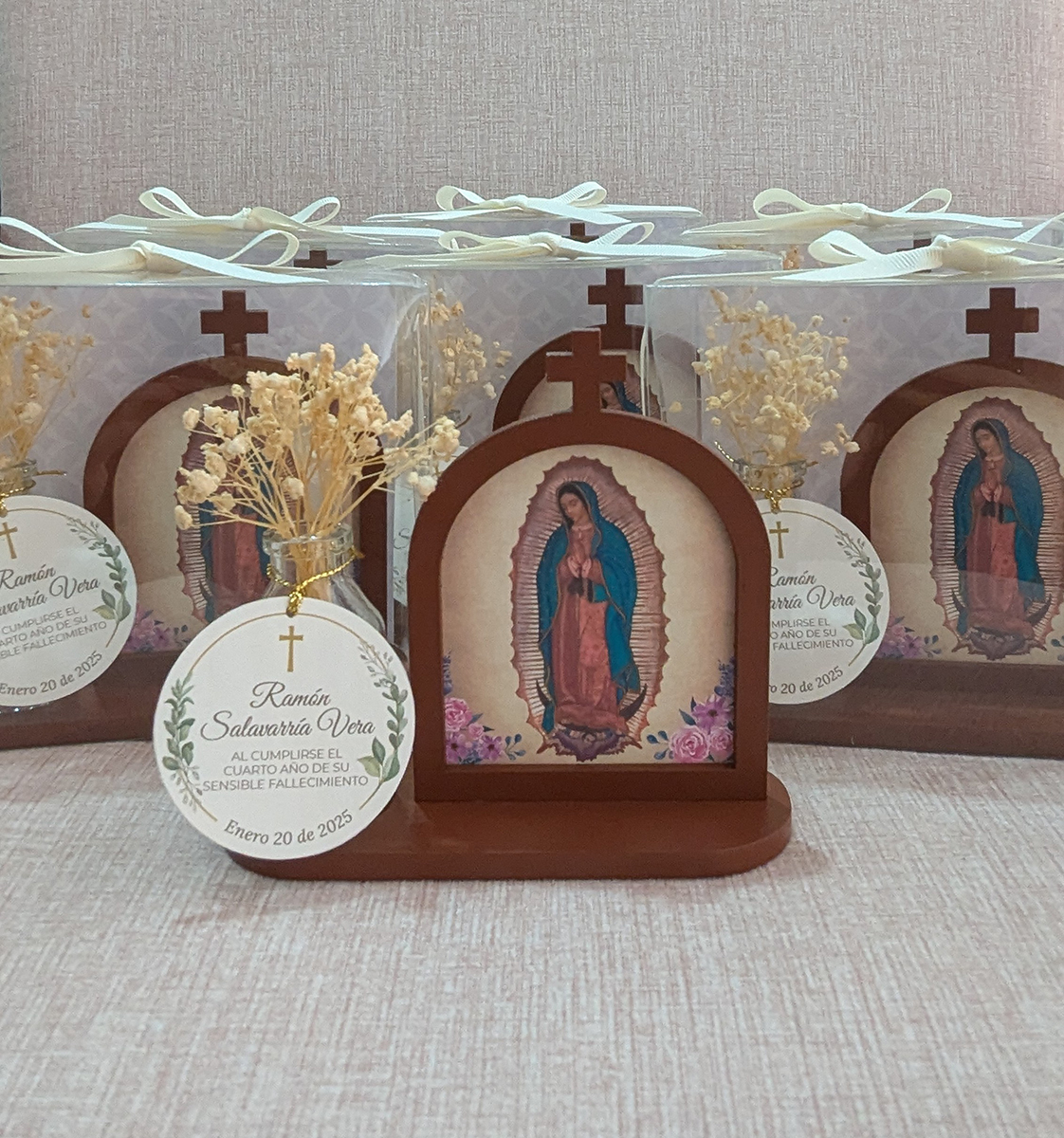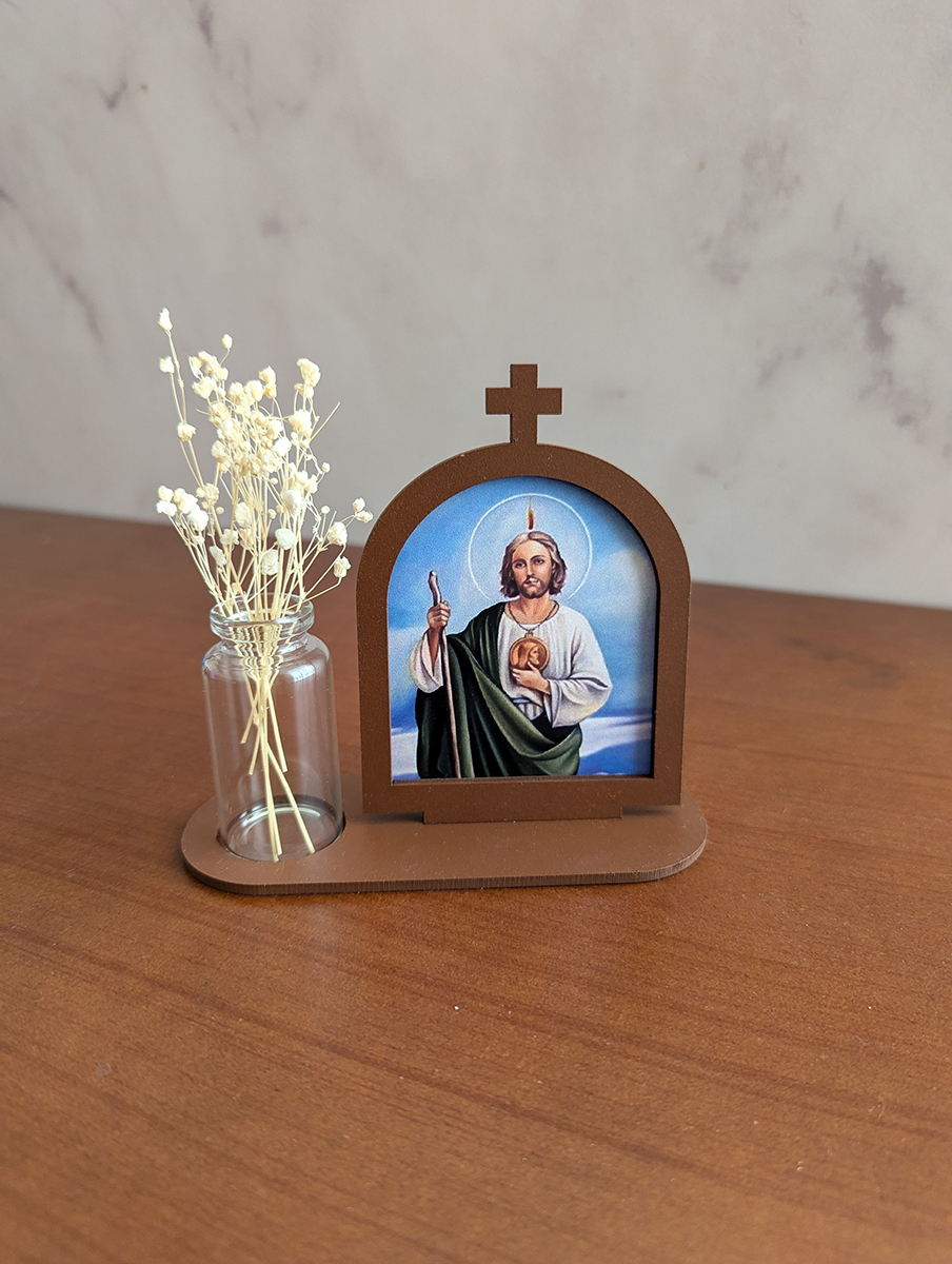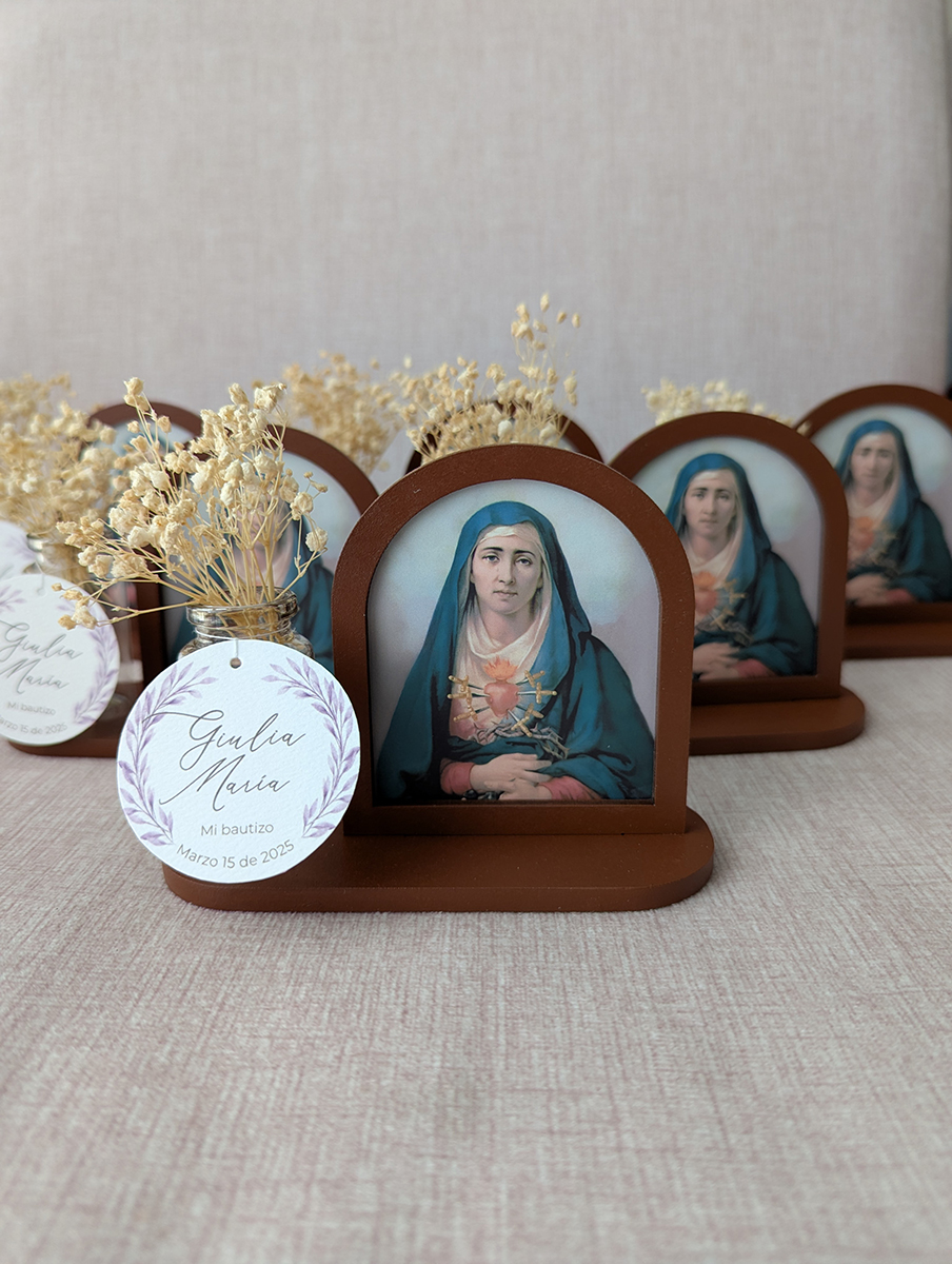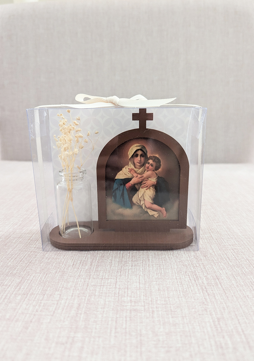 Retablo de madera con imagen religiosa junto con recipiente de vidrio y flores secas de aliento de bebé. Se entrega en caja transparente con lazo y etiqueta.