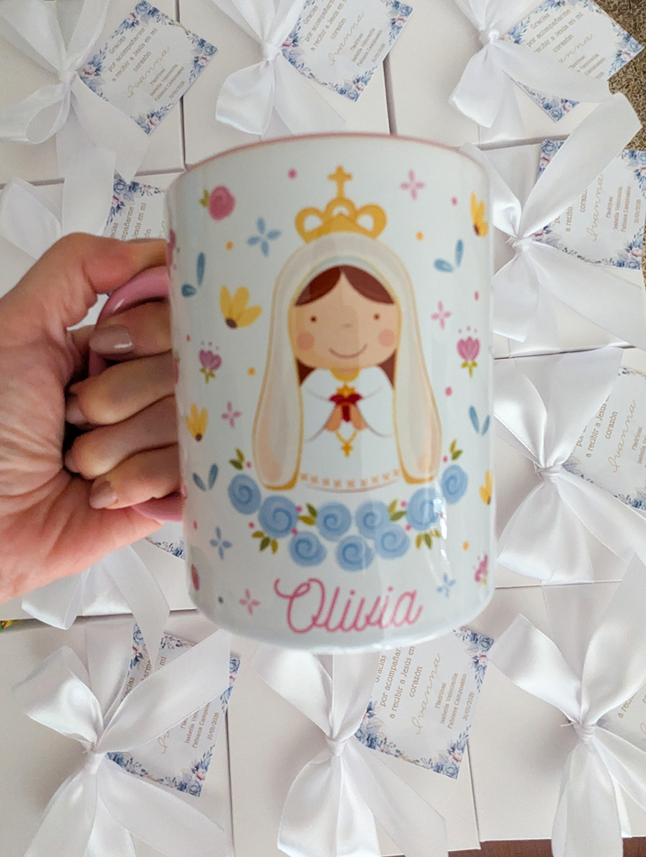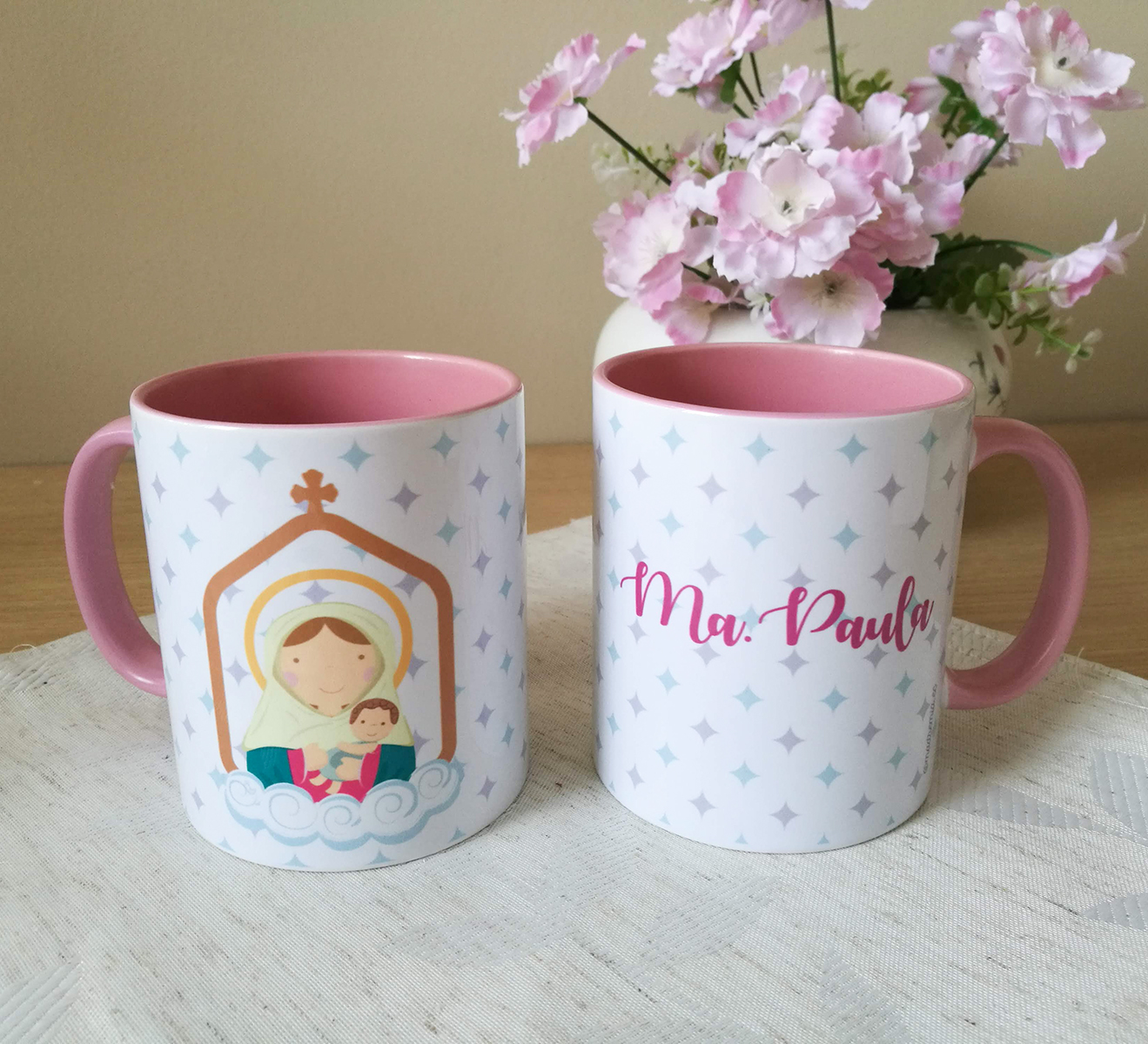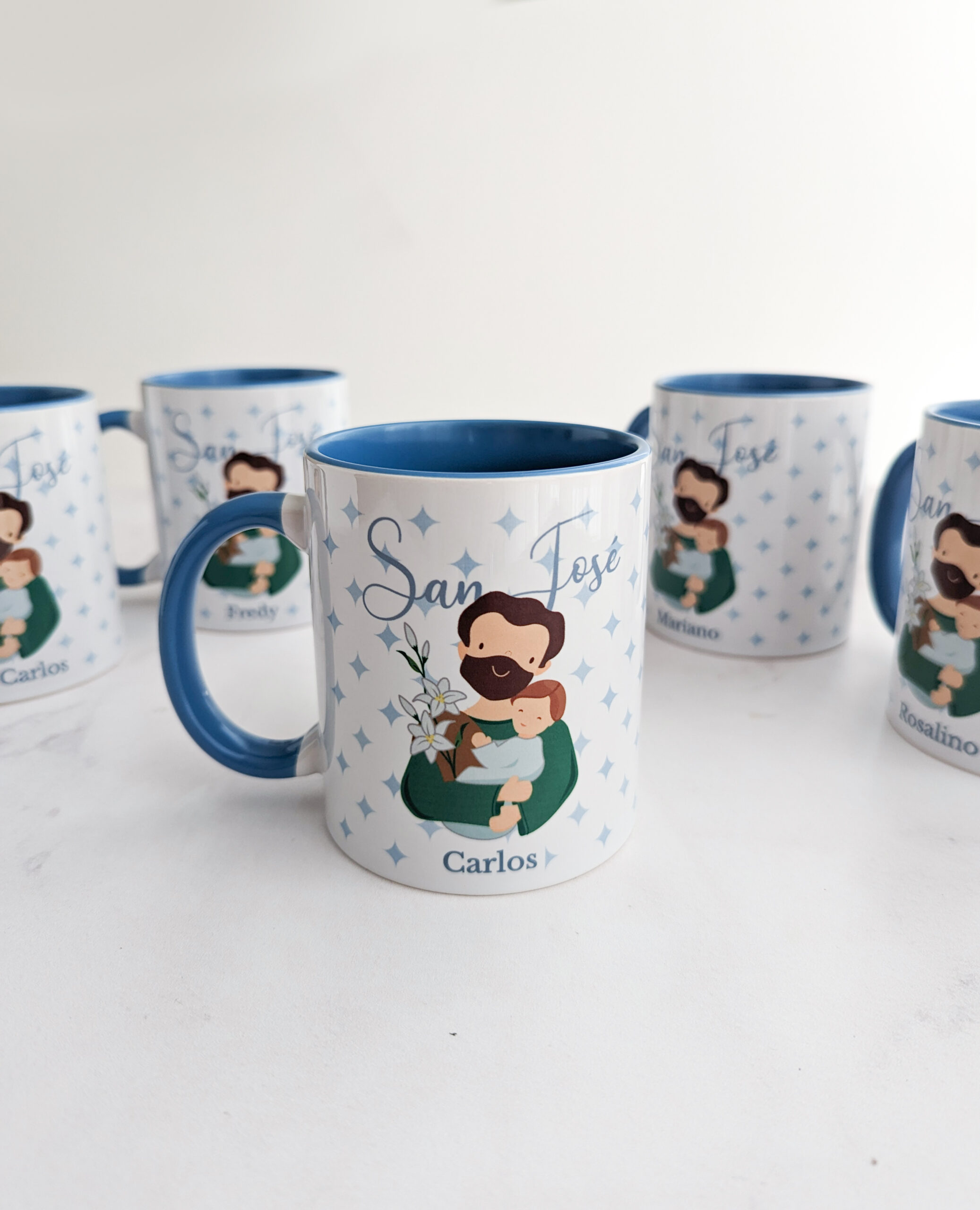 Nuestras tazas pueden personalizarse con un texto en la parte posterior, ya sea el nombre, una oración o una frase. Disponibles con cualquiera de nuestras ilustraciones: -San José, Sagrado Corazón, Jesús -Virgen de Guadalupe, Virgen de Schoenstatt -Virgen de Fátima, Virgen María Auxiliadora, entre otros.